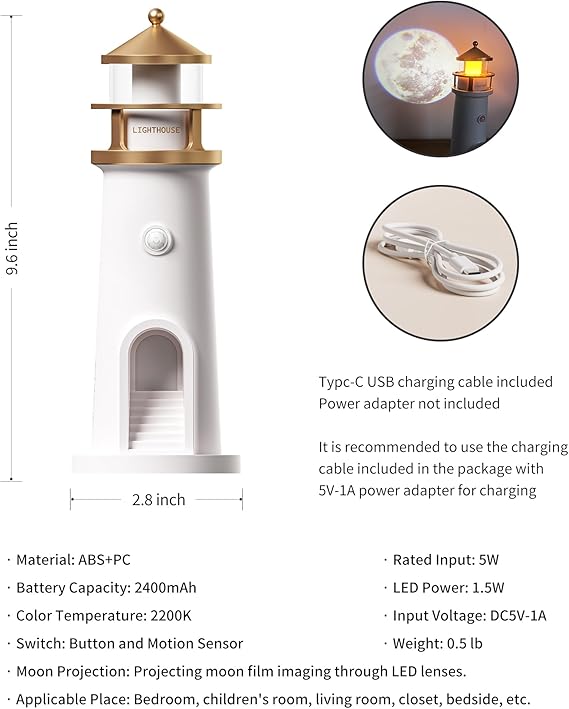 - Package Inclued & Size: 2 x LED moonlight projection lighthouse night lights, 2 x USB Type-C charging cables, 1 x manual. // Size: 2.8"D x 2.8"W x 9.6"H (Tips: We hope you can get the best shopping experience. If your lamp has any defects or stops working during this period, we will help you troubleshoot or send you a new product.)